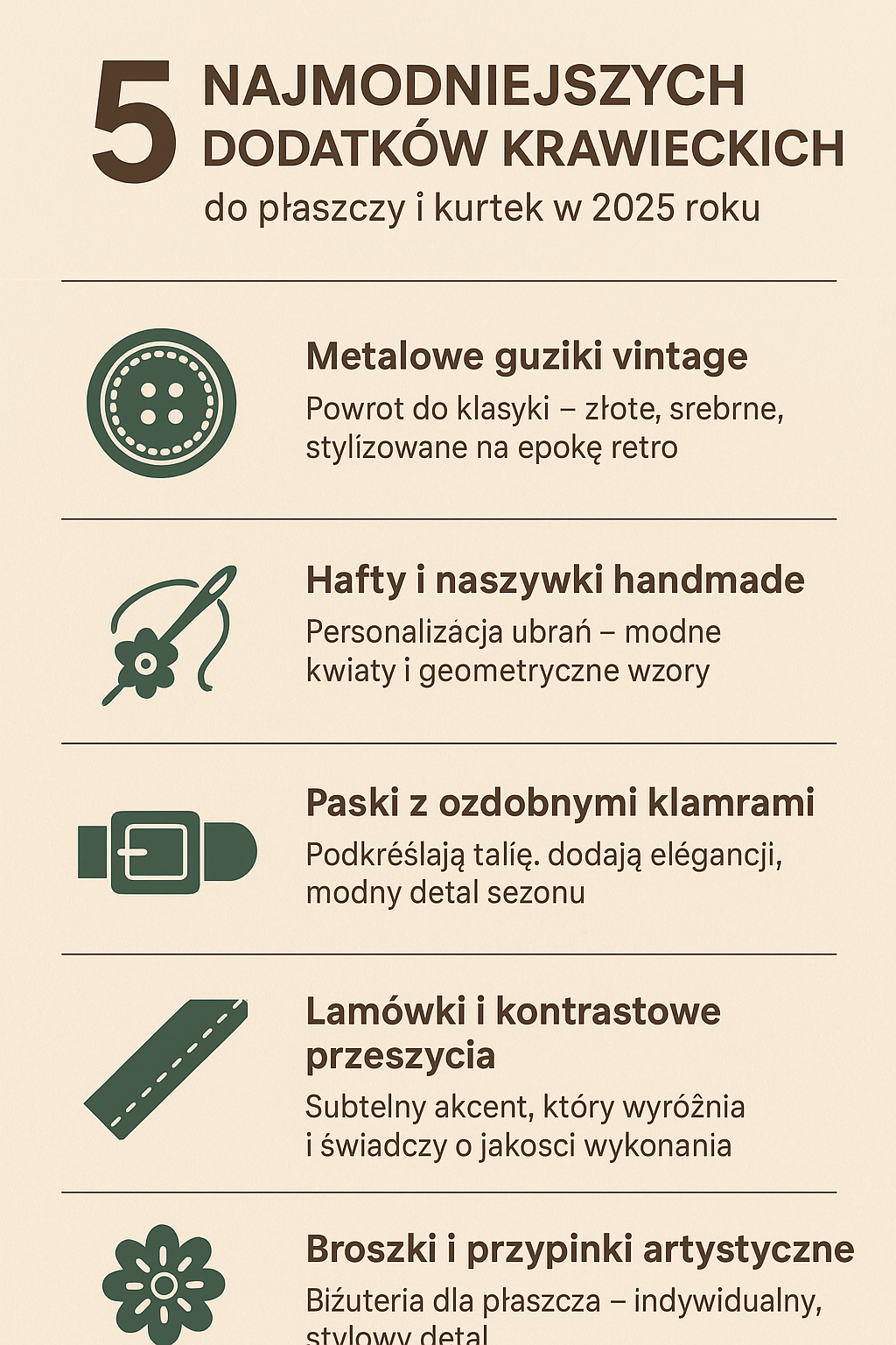 W świecie mody to właśnie detale decydują o charakterze stylizacji. Guziki z perłowym połyskiem, aksamitne lamówki czy metalowe klamry potrafią całkowicie odmienić wygląd klasycznego płaszcza lub kurtki. Poznaj najmodniejsze dodatki krawieckie 2025 roku i sprawdź, jak dzięki nim dodać swoim ubraniom szyku i indywidualności.
